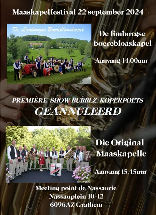Limburgse Boereblaoskapel de middag. Als een gezellige blaaskapel uit het Limburgse Genhout, heeft dit muziekgezelschap zich toegelegd op Tsjechische blaasmuziek en Egerländer muziek. Daarna verzorgt de Original Maaskapelle om 15.45 uur een optreden met een variëteit in muziekstijlen. Dat is het handelsmerk van deze 'Stimmungskapelle’. Het repertoire strekt zich dan ook uit van Egerländer, Böhmische en Moravische muziek aangevuld met Oostenrijkse en Oberkrainer muziek tot Limburgse liedjes, schlagers en Spaans-Mexicaanse melodieën.