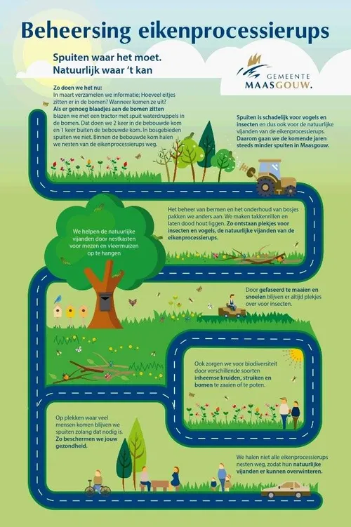 Heeft u op uw eigen perceel te maken met besmette eikenbomen, dan bent u zelf verantwoordelijk voor de bestrijding. De gemeente Maasgouw raadt u echter sterk af om de rupsen zelf te bestrijden. Het beste kunt u hiervoor een deskundig bedrijf inschakelen.