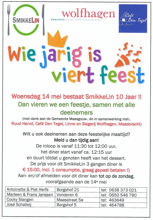 LINNE - Op woensdag 14 mei 2025 viert eettafelproject SmikkeLin in Linne haar tienjarige bestaan! En wie jarig is, viert feest.